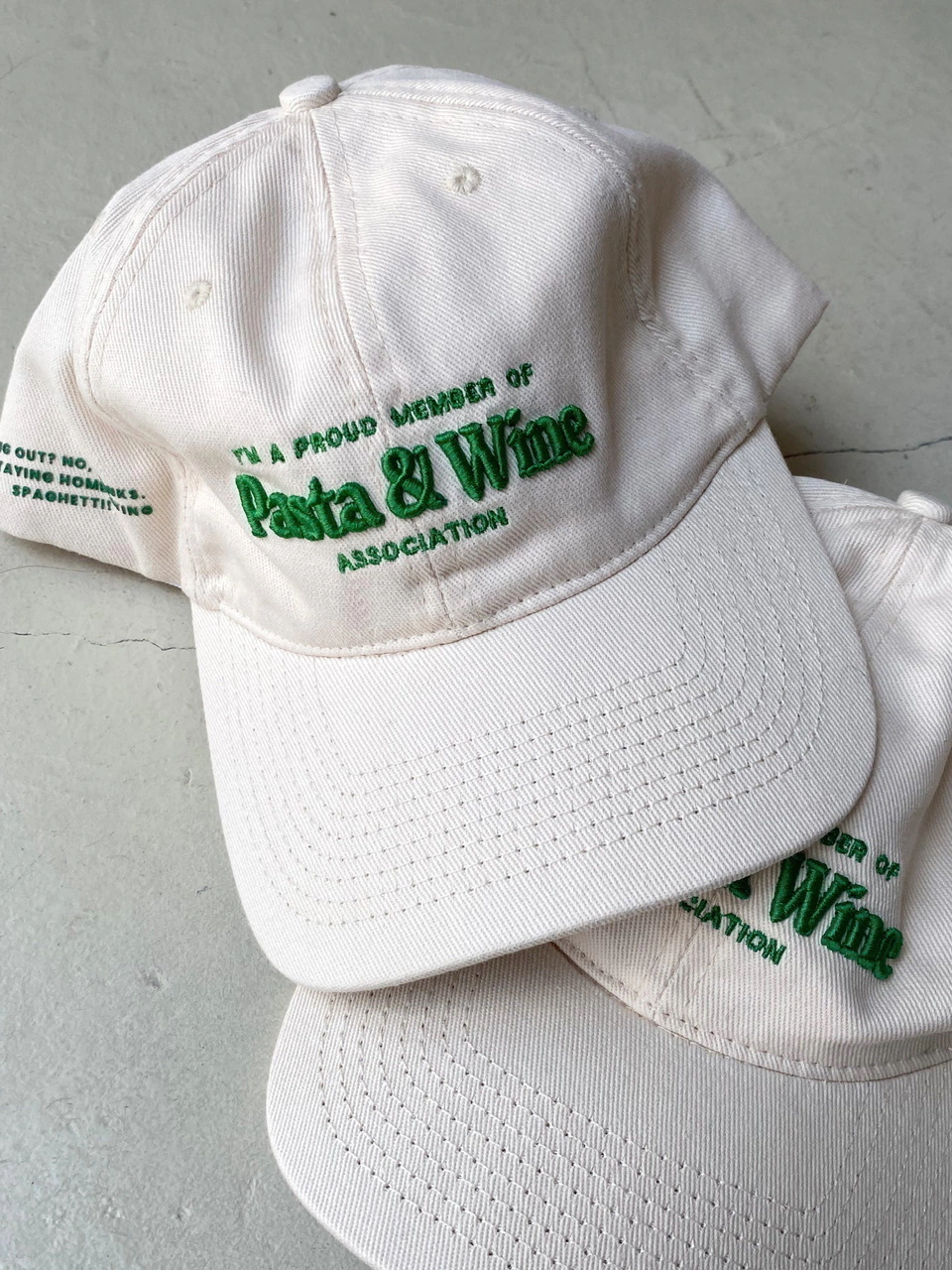 Boné na cor off white, com bordado frontal “I'm a proud member of Pasta & Wine association””!