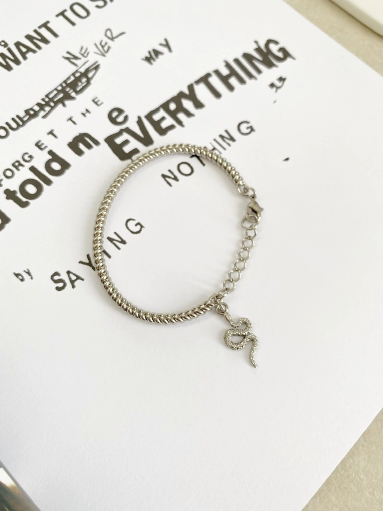 Bracelete torçido em Zamac com banho prateado e banho de verniz, fechamento de mosquetão e pingente de cobra em Zamac com banho de verniz.