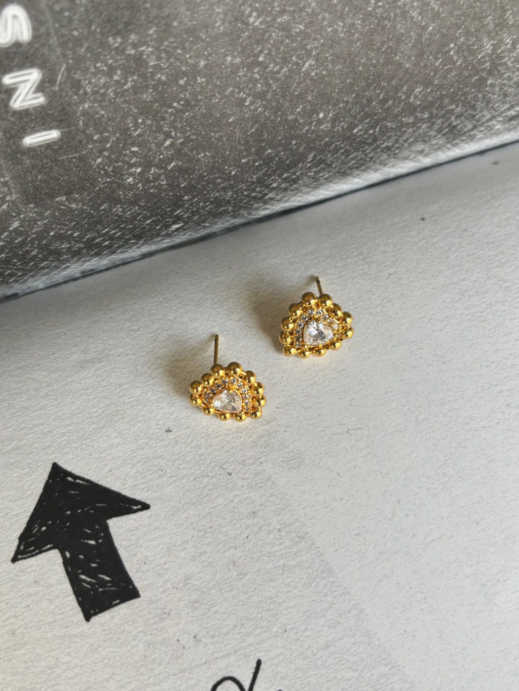 Brinco semijoia folheado a ouro com zircônias, em formato de coração. 1,3cm x 1,3cm