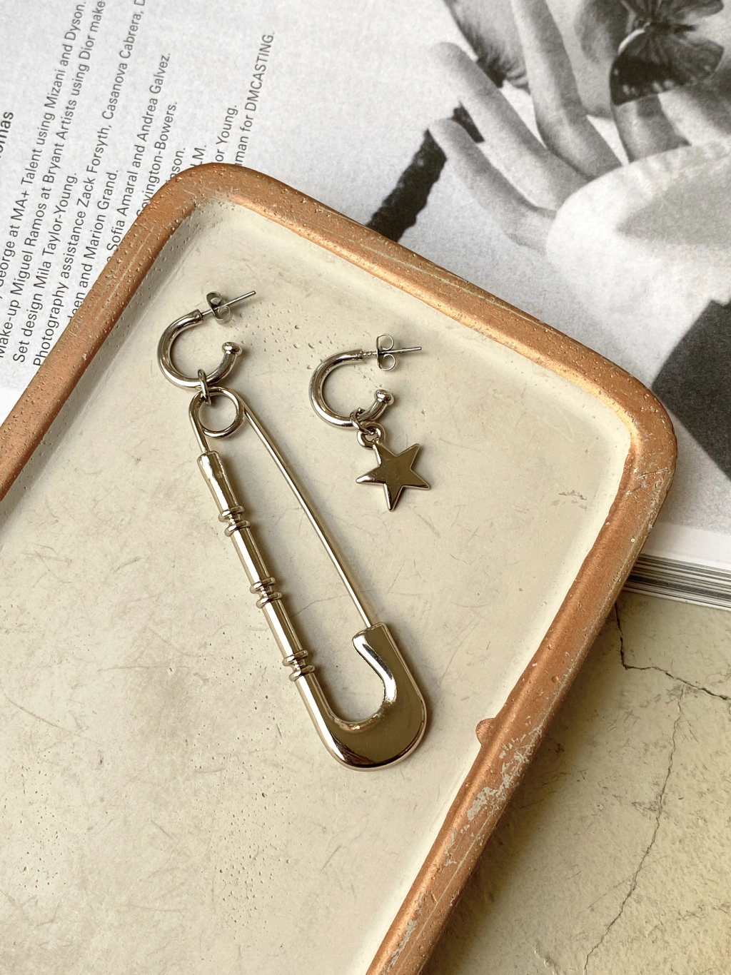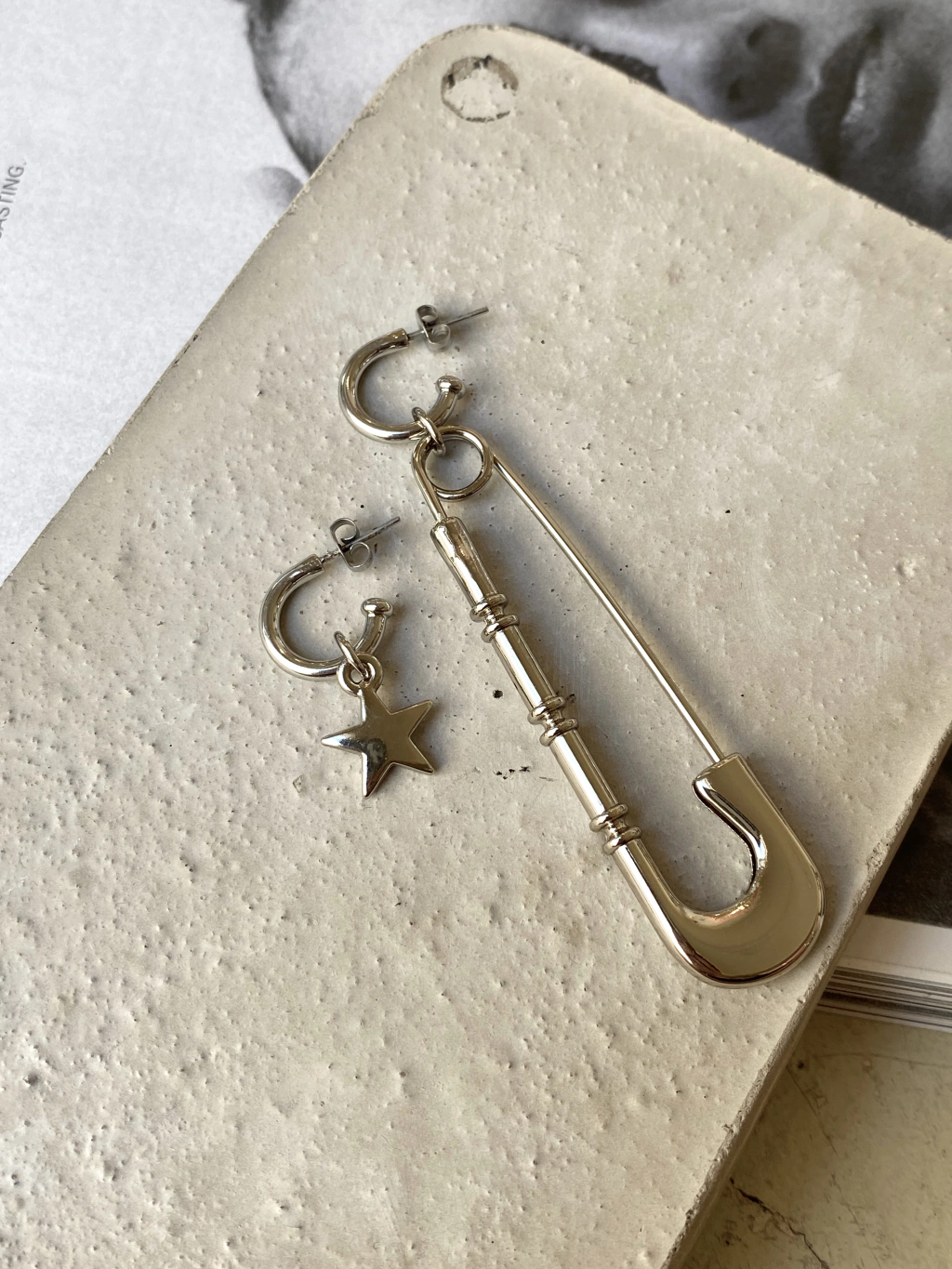 Brincos assimétricos, uma unidade em argola dourada com pingente de alfinete e outra com argola dourada e pingente de estrela.