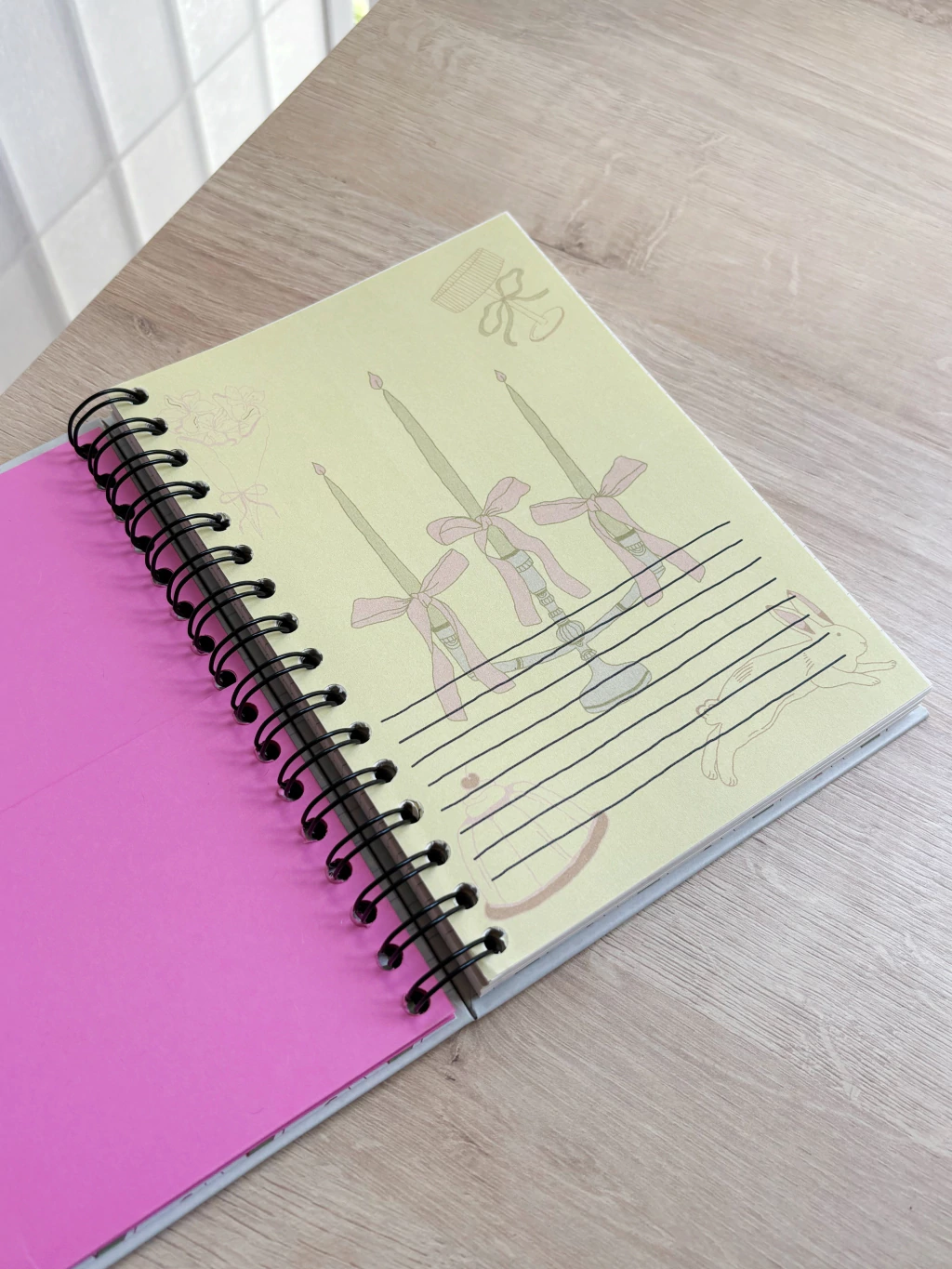 Caderno em tamanho A5 | 100 folhas | Capa dura | Papel pólen offset 90g com impressão quadriculada cinza | Wire-o preto | Folha de bolso rosa