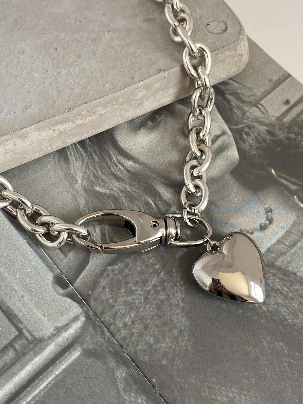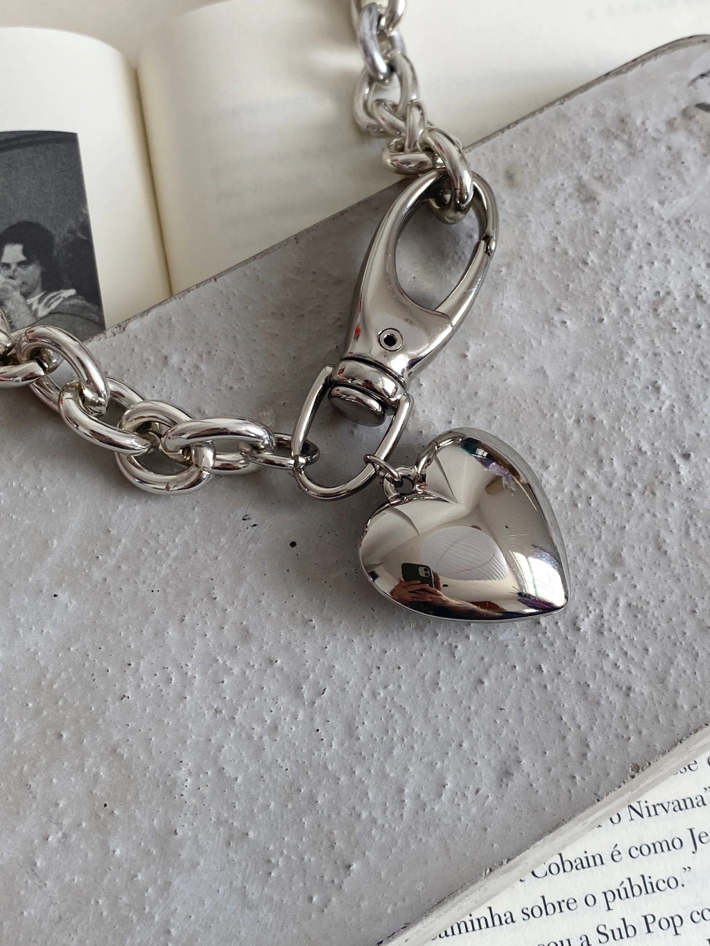 Corrente em alumínio anodizado, com banho prateado e banho de verniz. Pingente de coração e mosquetão em Zamac com banho de verniz italiano.