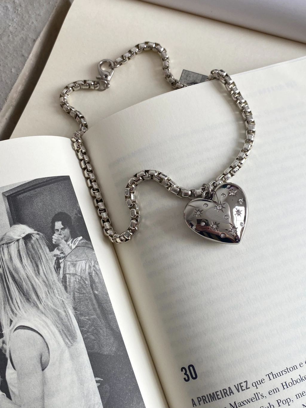 Corrente em alumínio anodizado, com banho prateado e banho de verniz. Pingente de coração com strass e mosquetão em Zamac com banho de verniz italiano.